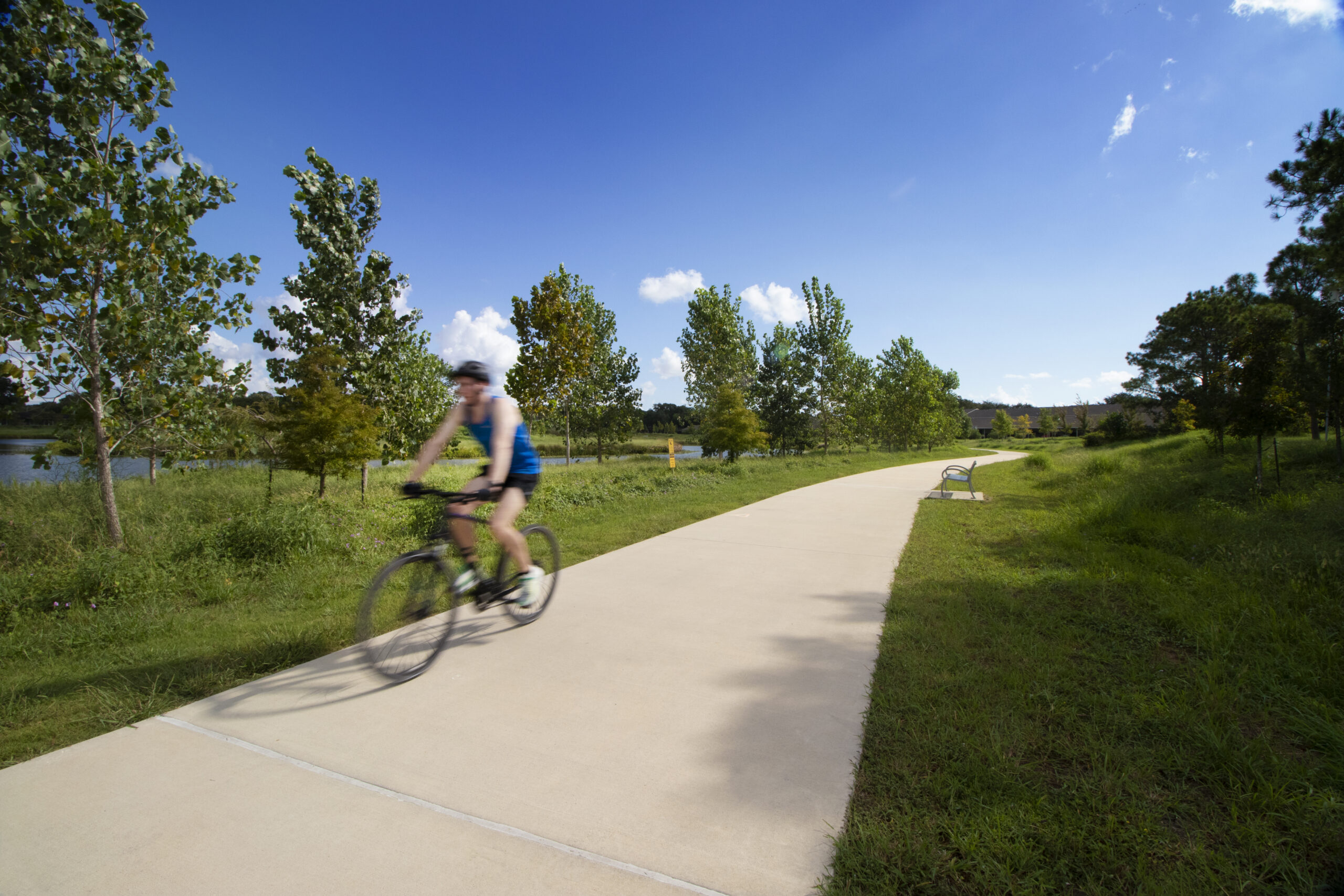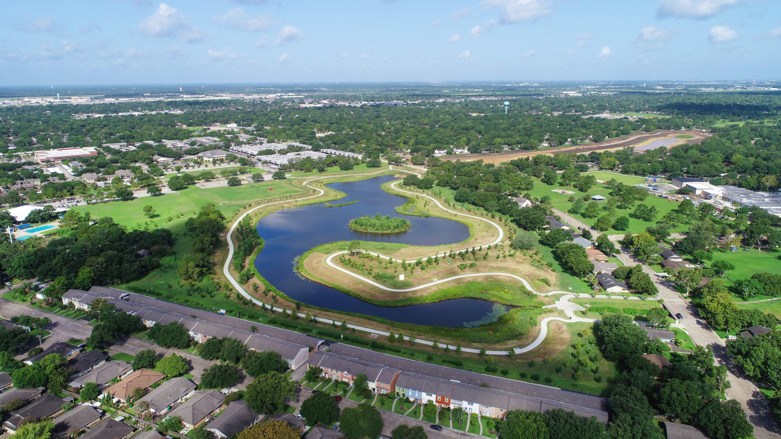 Background: Located in the heart of Clear Lake residential community near Houston, the visionary project of Exploration Green epitomizes a successful transition from a once-popular golf course to a sprawling 880.6-acre-foot, sustainable detention facilities, fulfilling roles of flood control, enhancing water quality, and providing a verdant natural habitat for wildlife and recreation space for residents. The transition from a golf course to a pragmatic, environment-centric space stemmed from a compelling need for improved drainage control and flood management, was driven by the residents and expertly addressed by the Clear Lake City Water Authority (CLCWA).   The initiative’s backbone, Exploration Green, was divided into five meticulous phases and conceived with community input, unifying expert planning and genuine residential needs. Planned by SWA Group architects and designed and managed by the engineering firm Lockwood, Andrews & Newnam Inc., the project metamorphosed into a massive nature park, encompassing five substantial in-line wet bottom detention ponds, each capable of holding approximately 100 million gallons of stormwater, crucially mitigating flood risks.