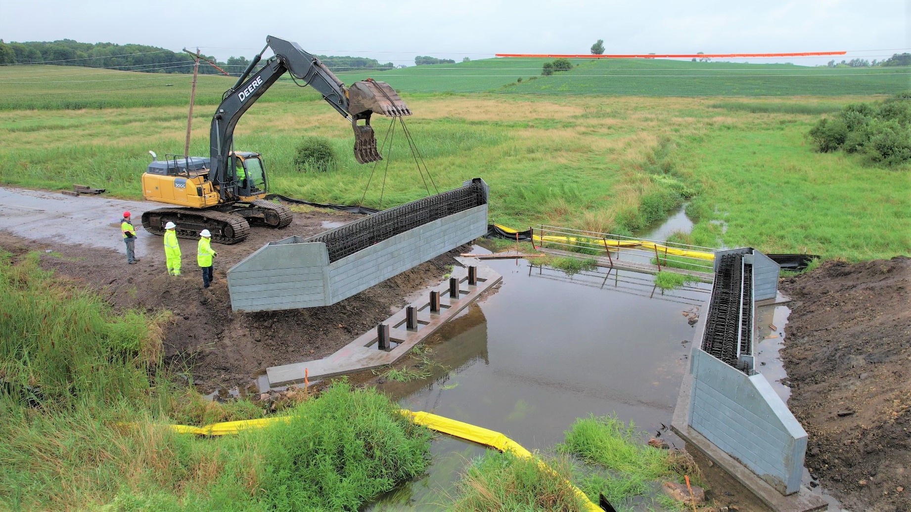 The Eau Claire County maintenance crew used their own excavator to install the abutments in less than an hour. Since the prefabricated abutments are delivered complete with formwork and reinforcing steel, they were installed on the foundation and ready to be filled with concrete on day one. Additionally, there was no need for dewatering, which is usually typical with box-culvert construction.