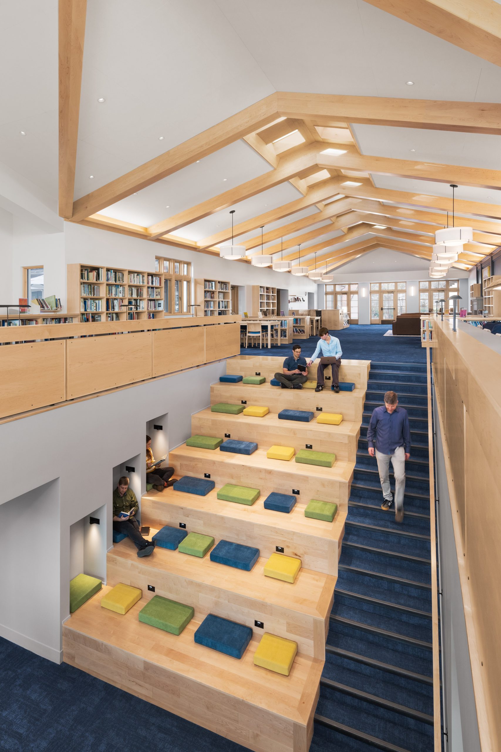 The two-story, 16,000-square-foot building includes media and technology studios, classrooms, a ceramics studio, study pods, offices, a double-height terraced reading and lecture space, and the school’s library collection.
